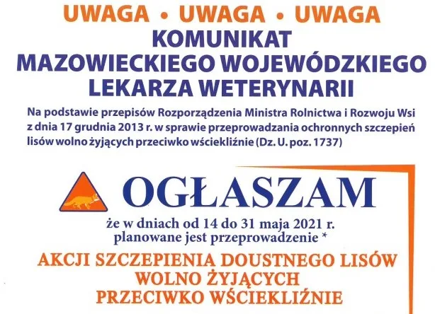 W dniach od 14 do 31 maja 2021r planowane jest przeprowadzenie akcji szczepienia doustnego lisów wolnożyjących przeciwko wściekliźnie. Szczepionka będzie zrzucana z samolotów w ilości 30 dawek na 1 km2 na całym obszarze objętym szczepieniami. Zrzuty obejmują kompleksy leśne, pola i łąki z pominięciem akwenów wodnych i terenów zabudowanych. Dawkę szczepionki stanowi pakiet w postaci krążka koloru zielono-brązowego o intensywnym zapachu rybnym. Dotknięcie szczepionki przez człowieka spowoduje, że nie zostanie ona podjęta przez lisa. Każdy kontakt człowieka ze szczepionką należy niezwłocznie zgłosić do lekarza medycyny. Każdy kontakt zwierząt domowych i zwierząt gospodarskich ze szczepionką należy niezwłocznie zgłosić do lekarza weterynarii. Po wyłożeniu szczepionki przez 14 dni psy należy prowadzić na smyczy a koty trzymać w zamkniętych pomieszczeniach.